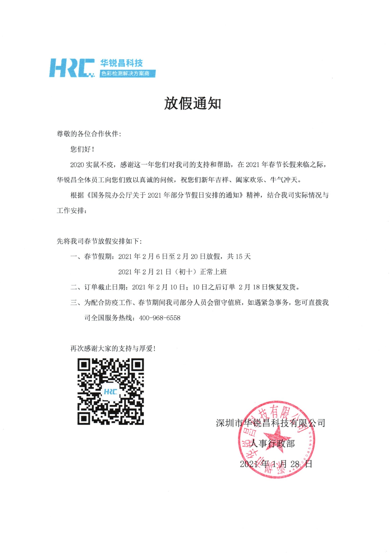 三、為配合防疫工作、春節(jié)期間我司部分人員會(huì)留守值班,如遇緊急事務(wù),您可直撥我司全國(guó)服務(wù)熱線:400-968-6558